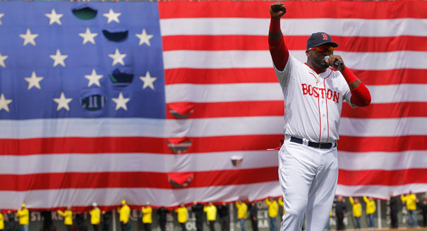 Yesterday at Fenway Park, Boston stood proud and helped a city get past the tragic bombings that occurred on Monday at the Boston Marathon. After a day where Boston was on lockdown as law enforcement searched for a suspect in the bombing, Bostonians came out in droves and not only celebrated their city, but also to take their minds off of the past week and get lost in watching their Sox in action. The Red Sox held an extended pregame ceremony, as a they showed a touching video from the past, set to Jeff Buckley’s “Hallelujah”. They then brought out workers from the Boston Marathon, and law enforcement from the Boston area. Honesty, at this point if you weren’t fighting back tears, you aren’t human. I know I was trying to keep myself composed. Whether it worked or not, I can’t say. They then brought out a guy who had helped save a child’s life, a man who was injured at the Marathon, and a disabled man in a wheelchair who’s Dad always pushes him in the Boston Marathon. All three threw out the first pitch, and then they gave the mic to the returning David Ortiz to speak…