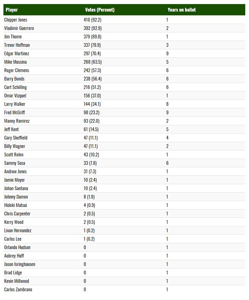 First, it was very obvious going into Wednesday that Chipper, Vlad and Thome were locks. All three were over 90% for the polling (which was sitting at around 55% of the ballots made public) that morning. Hoffman was a bit dicier, as he was sitting around 78.2% of public ballots. It appeared on the surface that he would get in, since he fell just five votes short in 2017.