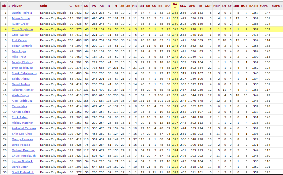 I decided to set a baseline. I went with batters with 180 or more plate appearances against the Royals, since that would show a more consistent level of sustained success. While it might not be everyone’s first choice for determining success, I started with batting average:
