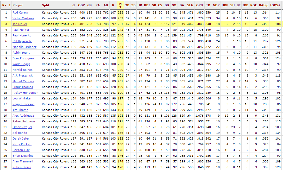 While Hall of Famer Rod Carew leads the pack here, it’s interesting to see Victor Martinez right behind, trailing by only 11 hits. It makes more sense when you remember that Martinez played almost his entire career in the American League Central, playing for Cleveland or Detroit for 15 of his 16 seasons.