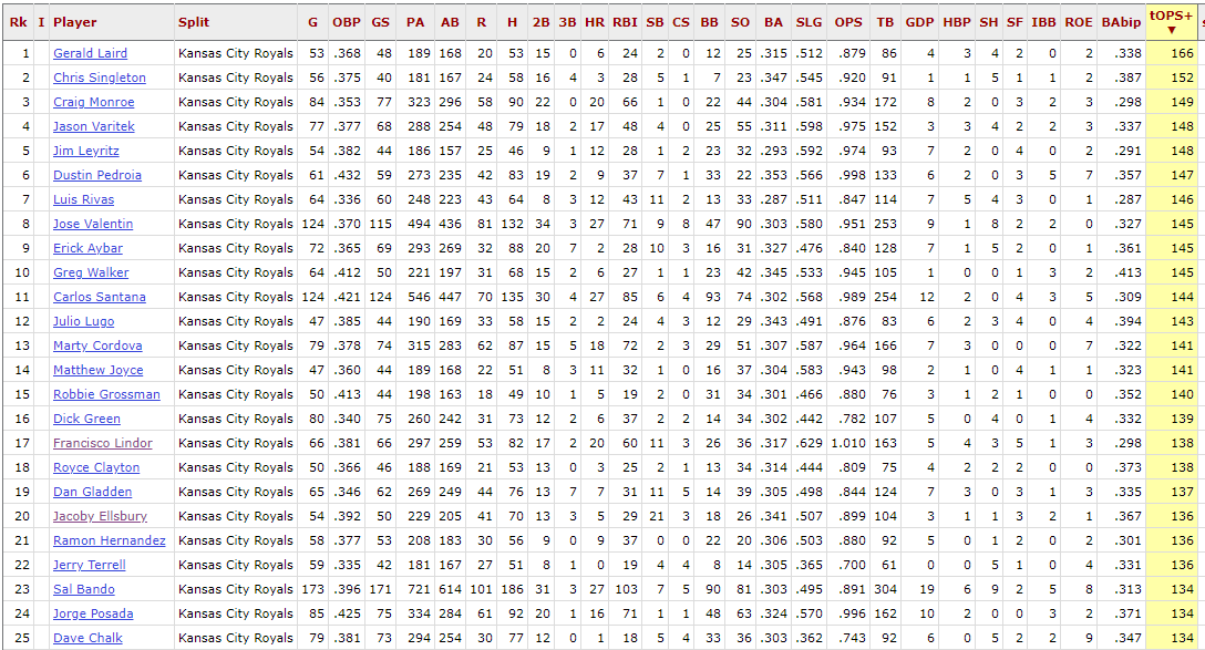Diving deeper down the list, the highest active player is Dustin Pedroia at 147, and a few more notches down you get Erick Aybar at 145 and Carlos Santana at 144. With tOPS+ being an adjusted stat and not a cumulative one, it makes sense it would be the one with players that wouldn’t just pop into your head. But considering we are basing this off of more than 180 plate appearances, it is still impressive at what Laird, Singleton and Monroe did against the Royals over the years.